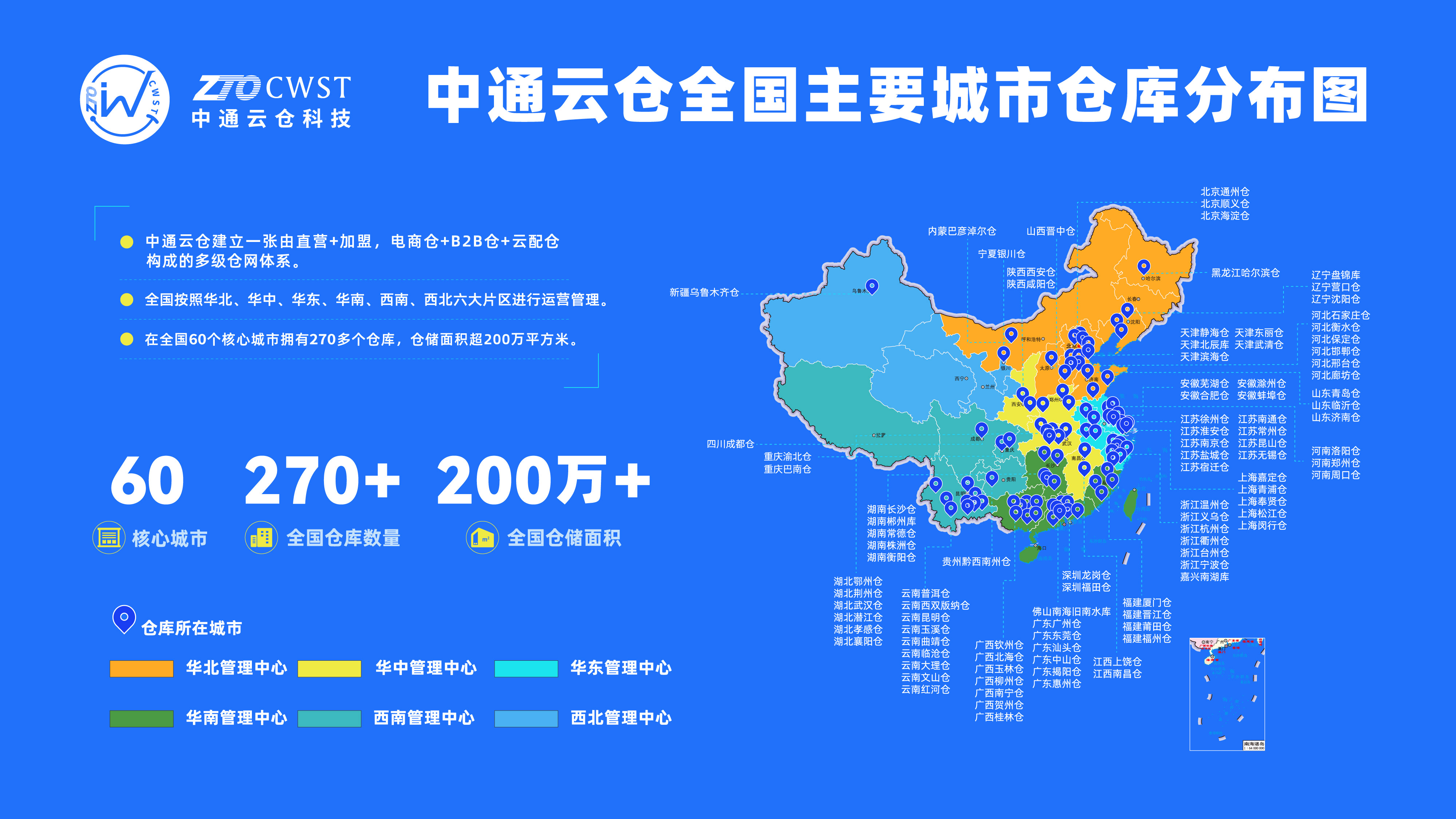中通云倉科技建立了一張由直營+加盟,電商倉+B2B倉+云配倉構(gòu)成的多級倉網(wǎng)體系。全國按照華北、華東、華南、華中、西南、西北六大管理中心進(jìn)行運營管理。在全國60個核心城市擁有270多個倉庫,倉儲面積超200萬平方米。了解更多